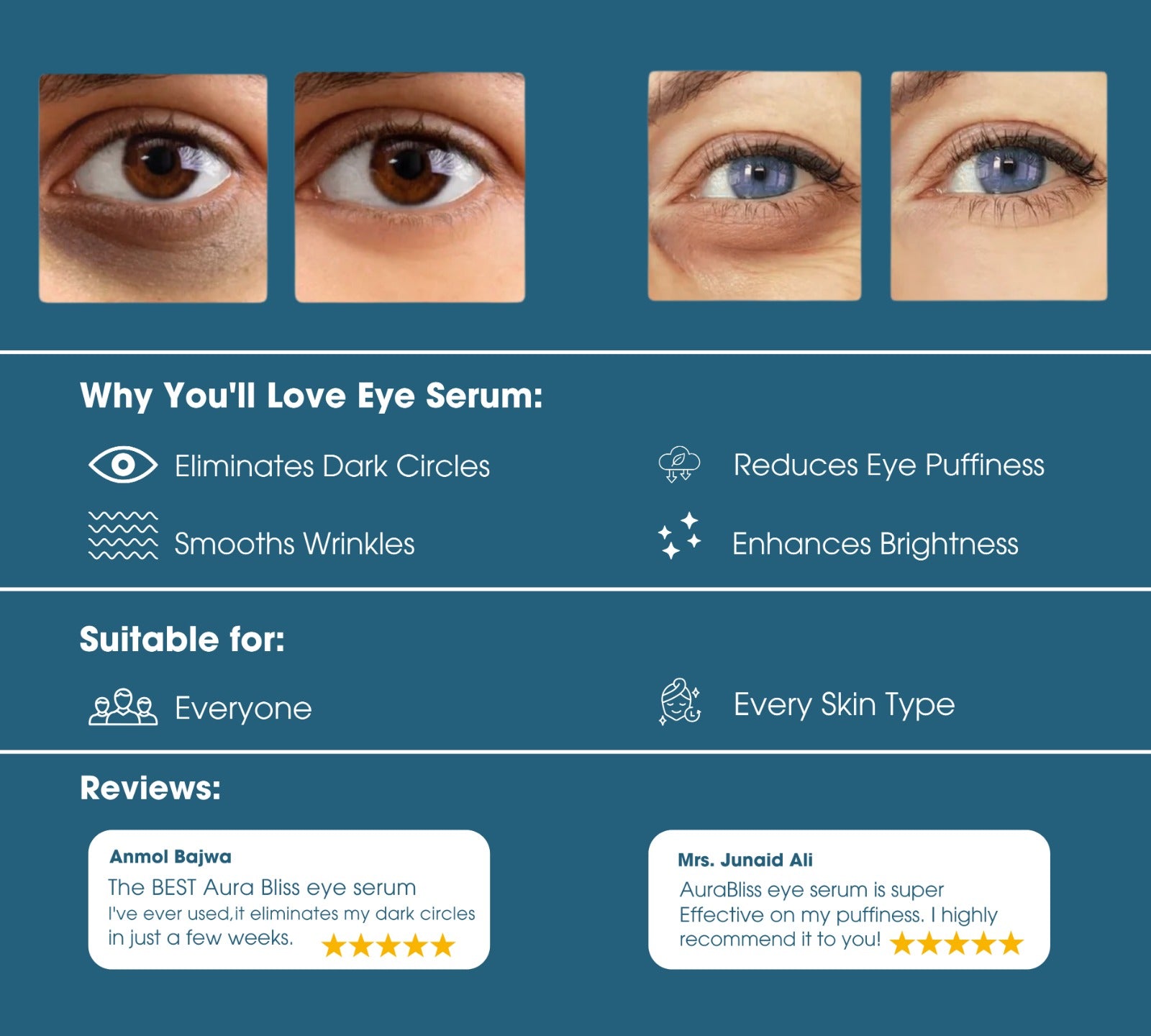 Aura Dark Circle Eye Serum Say goodbye to tired-looking eyes with Aura iSerum, your new secret weapon against dark circles and puffiness. The dual-action roller applicator delivers a refreshing massage while the advanced serum penetrates deep to diminish shadows and restore luminosity. Infused with skin-brightening ingredients, this lightweight formula absorbs instantly without greasy residue. Experience cooler, smoother under-eyes in just days. Transform your gaze and boost your confidence with every application—because beautiful eyes deserve premium care.